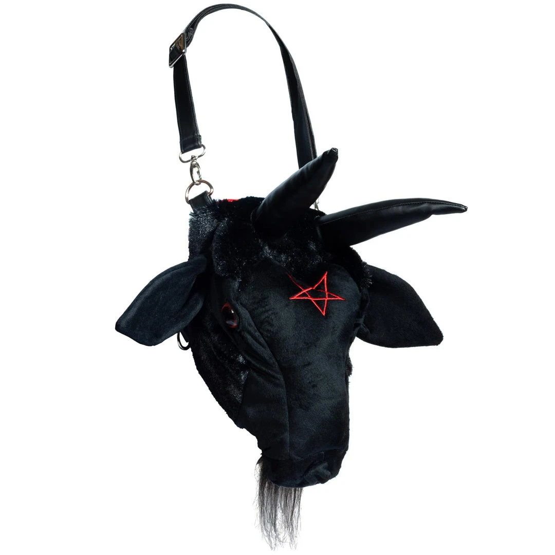 Goathead Baphomet plush purse / bag / backpack. Multi way strap system that can be worn as a backpack, shoulder purse or cross body bag. Super soft plush with embroidered pentagram, demonic red bead eyes, vinyl horns and back, tufted beard and deep interior that fits most combos of phone, wallet ect, zip closure with coffin zip pull. Super Evil-Super Cute . Size approx (not including horns ) 13 in (29cm)H, 7in (18cm) W, 6in (15cm) D.