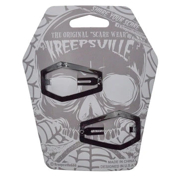 Kreepsville Coffin Snap Hair Clip Black. Come out of your coffin shell and feel alive in our coffin shaped hair clips, made with alloy metal. Designed and made by ghouls in the USA! Clip size: 2″ (5cm) x .9″ (3.0cm).