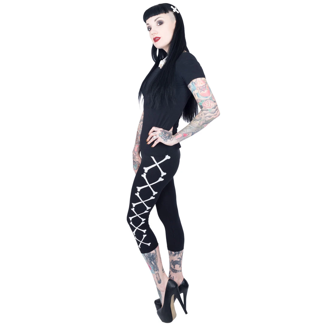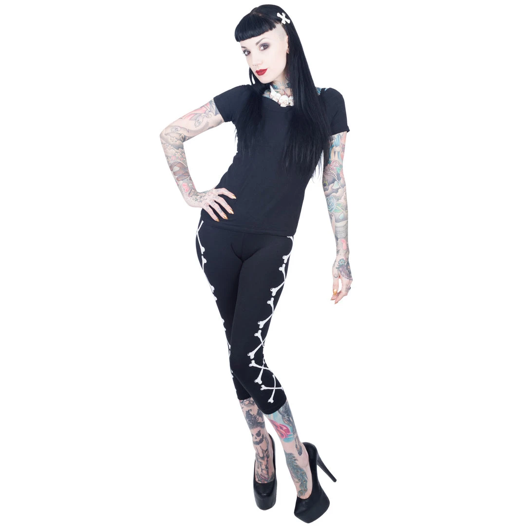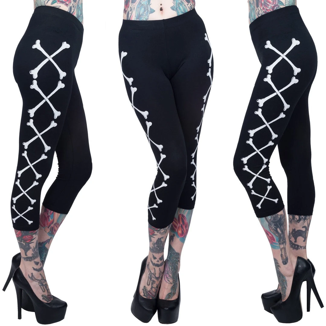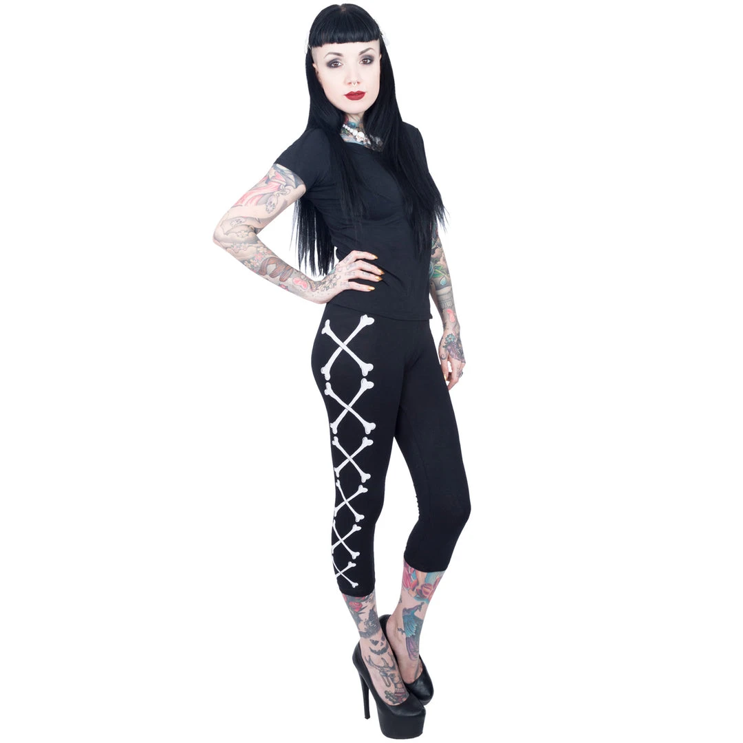 Crossbones capri pant leggings by Kreepsville 666, Crossbone design down both legs printed on black 95% cotton and 5% spandex capri leggings. Made by monsters in the USA.