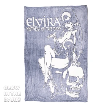 Elvira Comic Skull Glow in the Dark Throw Blanket, officially licensed Elvira product by Kreepsville, an oh-so soft and seductive comfort piece for any crypt. Best part of all, the one and only Mistress of the Dark will keep you company day and night with the amazing glow in the dark feature! Dimensions 44” (112cm) x 60” (152cm) Made with 100% super soft polyester coral fleece.