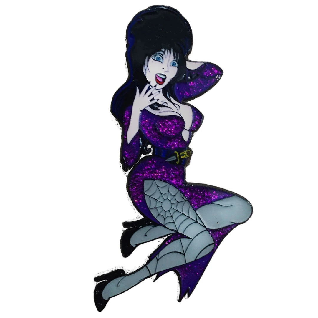 Special release official Elvira Mistress of the Dark enamel pin. XL size pin 3.5″ (9cm) high. With poison purple glitter dress and glitter shoe detail.