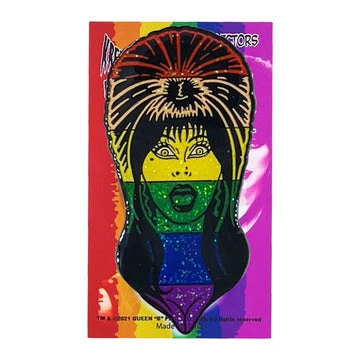 Show your pride with this officially licensed Elvira pin. Featuring rainbow glitter Elvira face enamel design with an epoxy finish . Size approx 2 in (5cm) high 1in (2.25cm) wide. Artwork by Count Porl Mchale.