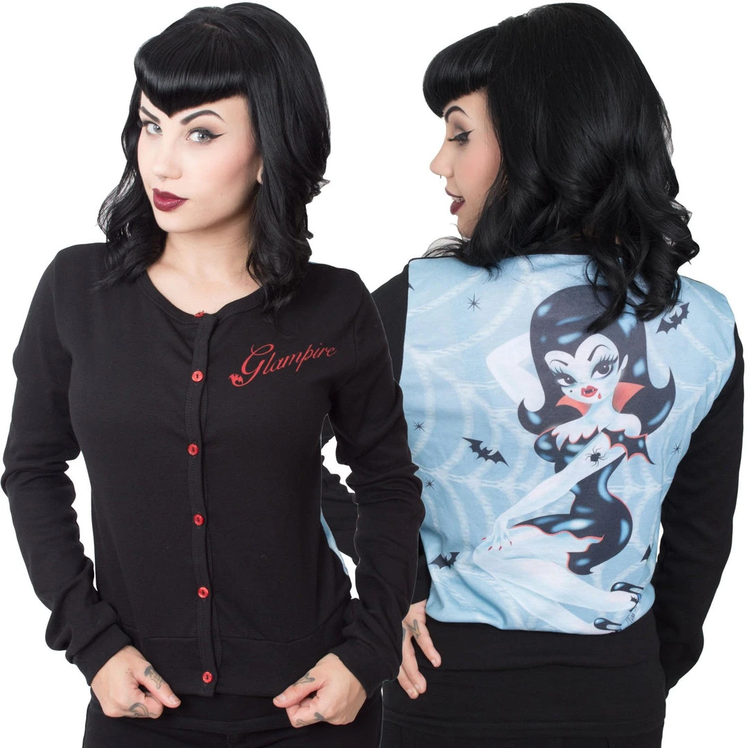 No lurking in the shadows this Glampire is always in the spotlight! Designed exclusivley for kreepsville 666 by Miss Fluff. Poly cotton cardigan with vampire red buttons and Glampire motif on front. Made after dusk in the USA.