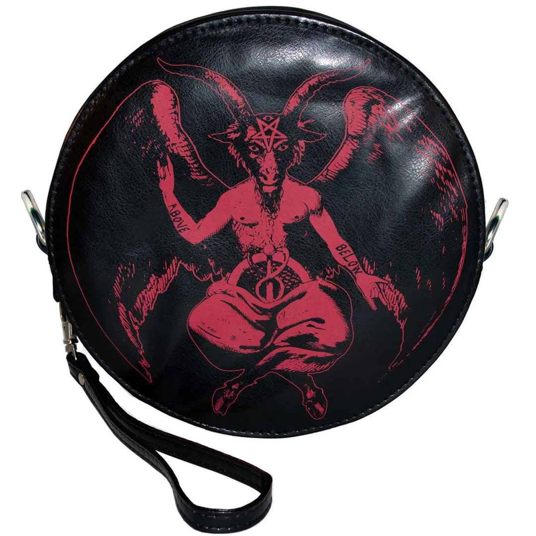 Everyday evil! Kreepsville 666 Baphomet Wristlet is round vegan leather with a red Baphomet print on the front and satanic symbols printed on the back messuases 7 inches around. Includes detachable shoulder strap for when you need your hands free to pray to the dark lord.