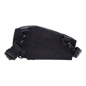 NEW design!! Convertible coffin Hip Pouch, Shoulder Bag, Crossbody wear it how you choose!! Measuring approx. 9IN X 6IN X 2.5 IN with three D rings in the back and clips on the straps so you can use it many ways, with two zippered compartments a large one in front and a small one with an id holder in the back!