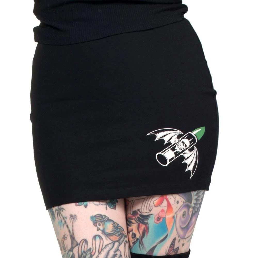 Kreepsville 666 Glamour Ghoul Mini Skirt! Who says ghouls cant be glamorous? Not us! Get down with your ghoul self in this skirt featuring a lipstick with batwings and print on the front and a ghoulish green glamour ghoul print on the back. 95% cotton 5% spandex. Made in the USA.