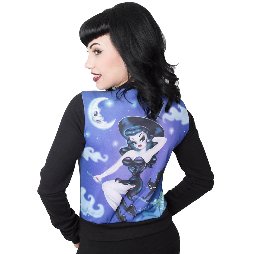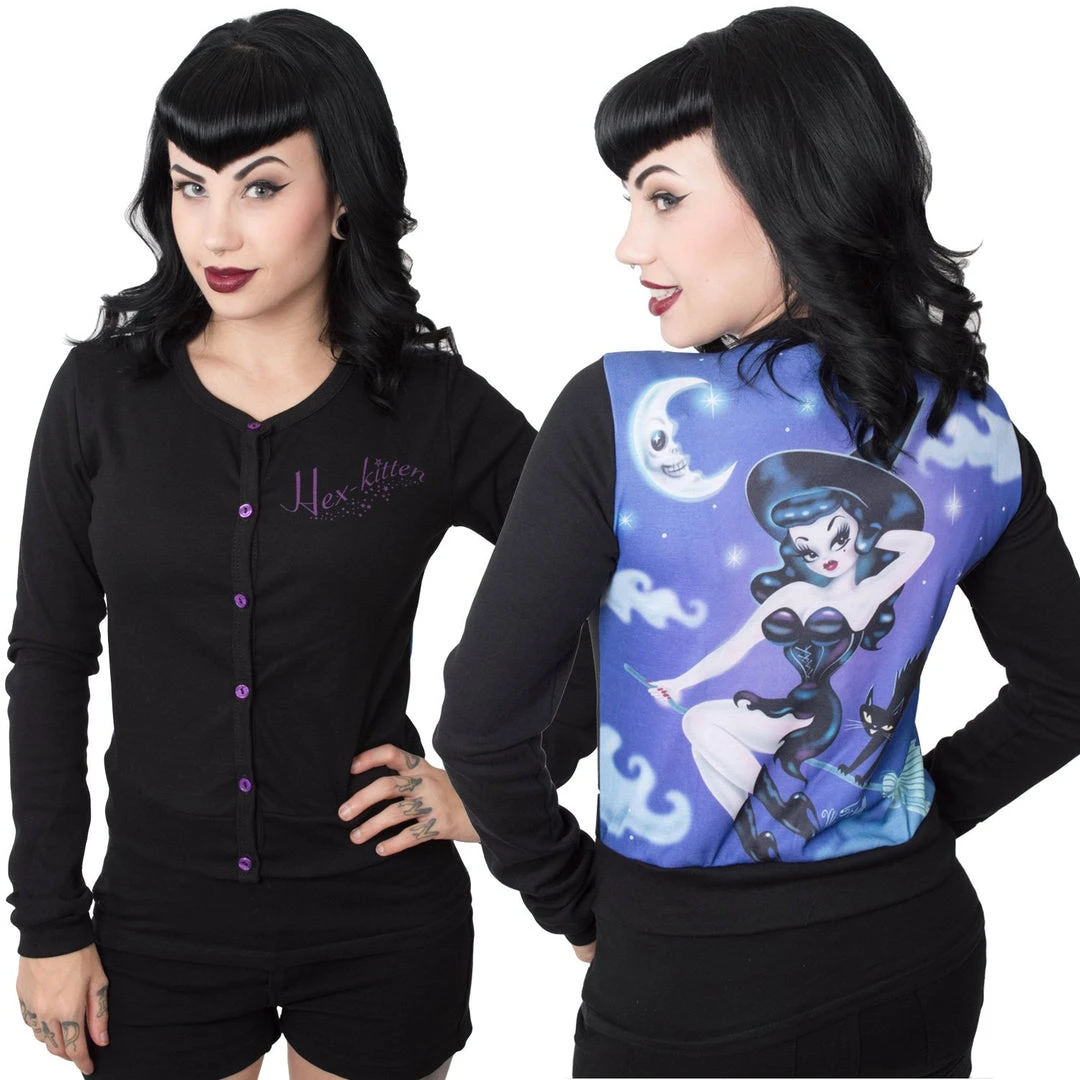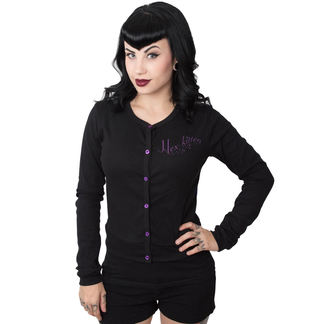 Dont believe in witches? You better believe in hex kitten shes gotta a spell made for you! Bewitching poly cotton cardigan featuring the artwork of Miss Fluff designed exclusively for kreepsville 666.Hex kitten motif on front and poisionous purple buttons. Made by magic in the USA.