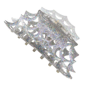 Kreepsville Spiderweb Hair Claw Clip Sliver. Put some scare in your hair with our eye-catching claw clips, made with shiny acrylic. Designed and made by baby bats in the USA! Clip size: 4.5″ (11.43cm) x 2″ (5cm).