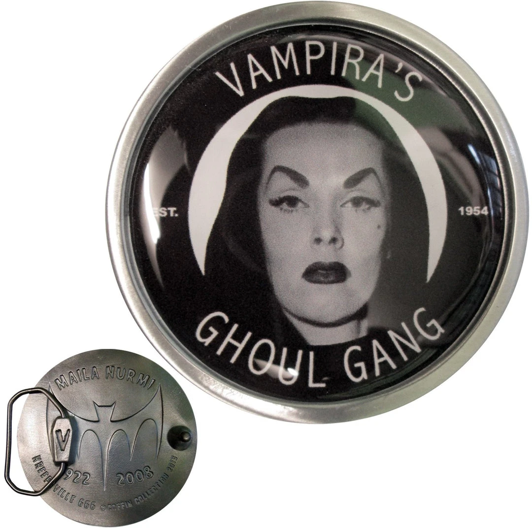 Kreepsville 666 Vampira Ghoul Gang belt buckle, Pewter belt buckle approx 8.5cm dia,Maila Nurmi tribute on back of buckle,Official licensed Vampira product made in the usa