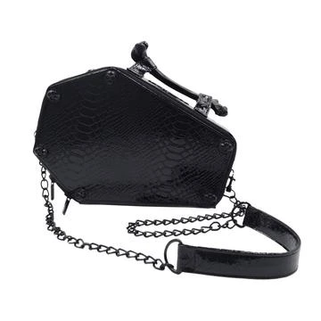 Revamp of our classic style! Kreepsville 666 coffin purse bag with replica bone side handle, super shiny croc skin PU fabric with black skull studs, detachable shoulder strap chain and inside ID pocket. coffin shaped zipper pulls. size approx 10 in wide (25cm) x 7.5 in high (18cm) x 4 in deep (9cm). Go dig our new coffin handbag!